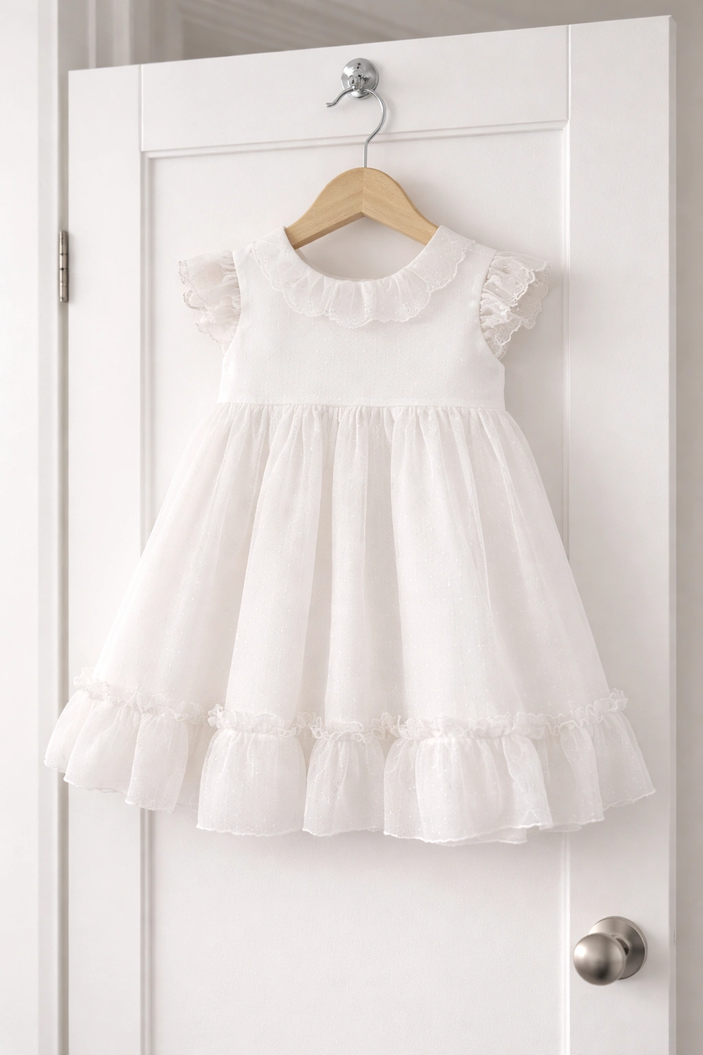 Conjunto confeccionado en gasa de plumeti, un tejido ligero y delicado que aporta elegancia y movimiento a la prenda. Su diseño se completa con adorno en cuello y mangas, detalles que realzan el acabado y aportan un toque especial y refinado.